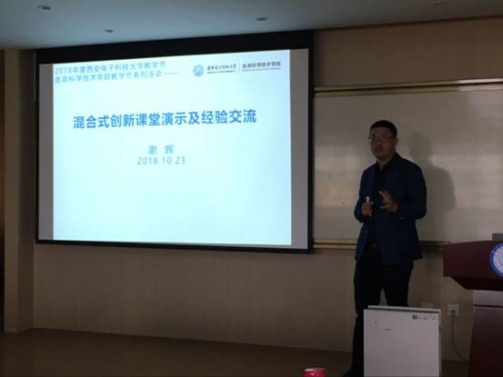 会上,谢晖老师以微生物学的一个知识点为例现场教学,展示课堂教学创新的理念、思路、方法与效果。演示结束后,谢晖老师针对传统课堂上存在的问题,分享了自己的教学经验和感悟—“学习培训,夯实教学基础;点滴积累,充实教学内容;潜心钻研,科研转化教学;注重员工,精细个性培养;立足需求,理论结合实践”。他以提高员工课程兴趣和学习自主性为原则,通过线上线下混合交互式、翻转课堂、实际应用拓展等丰富的教学活动,让参训师生深刻体会混合式教学的魅力。