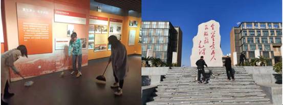 打扫完校史馆后,大家发现“全心全意为人民服务”雕塑周围有树叶等垃圾,又对其进行了清扫。