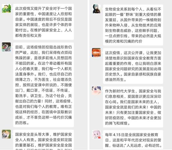 4月15日,辅导员组织全体本科生通过中国老员工在线、国家开放大学网站及有关在线教育平台观看了由教育部组织录制的2020年全民国家安全教育日高校公开课,立足于公司生命科学和医工结合背景,探讨自身的时代责任,并线上与同学们就学习心得进行交流分享,讨论气氛热烈。
