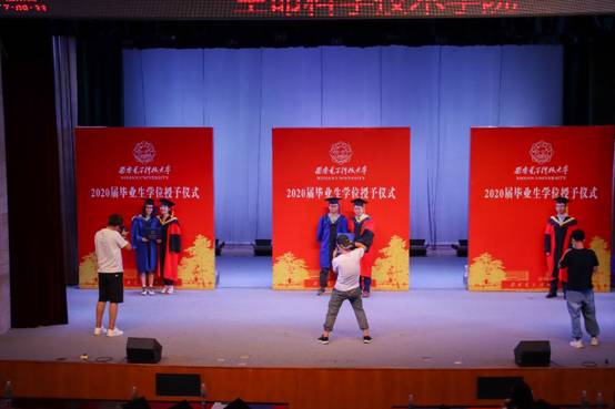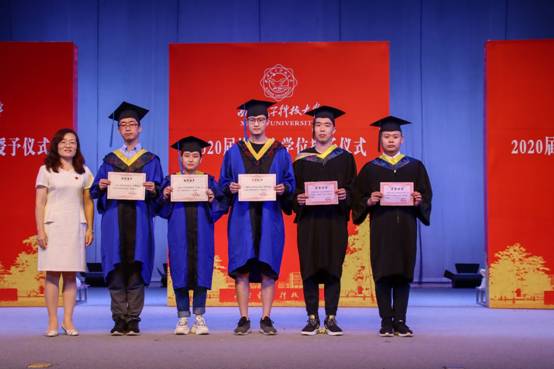 王丽玲为获得公司毕业之星提名、优秀毕业生标兵、优秀毕业生干部和优秀毕业生的同学颁奖。王忠良宣布授位决定,并与石光明、吕锐婵为公司2020届毕业生拨正流苏、颁发学位证书,并合影留念。