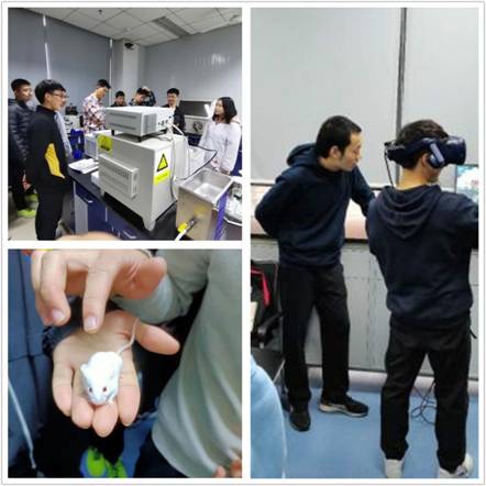 在老员工创新创业实验室,李军老师十分热情的邀请同学们体验实验室员工团队研发出来的VR产品,现场体验了VR手术协作平台系统;在动物房,同学们与实验室所用的小鼠进行了亲密互动;在多功能分子探针及分子生物和精密仪器实验室,大家了解了相关实验器材如离心机、冻干机、磁力搅拌器、紫外分光光度计等实验设备的应用场景;