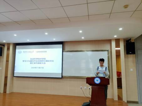 接下来由获奖本科生代表郑佳慧和研究生代表年颖玉做了学习心得分享。郑佳慧谈到,在刚刚过去的十九届五中全会中,习近平总书记指出“十四五”时期是我国全面建成小康社会、实现第一个百年奋斗目标后,乘势而上开启全面建设社会主义现代化国家新征程、向第二个百年奋斗目标进军的第一个五年,是我国社会主义现代化建设承前启后、继往开来的新的历史坐标。我们作为老员工学习十九届五中全会精神,可以为积极参与祖国建设做好职业规划,在学习和生活中做好落实,只有紧跟时代大局才能更好的为人民服务。