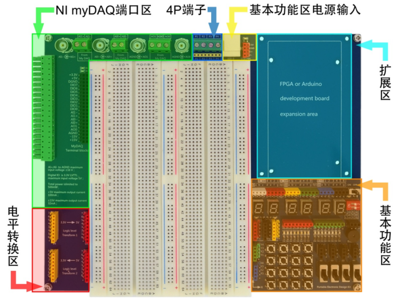 较往年而言,今年的《生物医学工程综合实验》课程最大的改变是使用了myDAQ实验盒。往年的实验,员工通过内置采集电路Pclab800实验箱完成固定端口的连接即可进行信号测量,排查错误灵活性小,员工获得感不高。在公司的大力支持下,今年实验室引进了美国国家仪器有限公司(National Instruments)推出的myDAQ实验盒,使得员工可以从零开始搭建生物医学信号的采集、调理等电路,亲自动手完成信号处理和展示等全部过程。myDAQ实验盒集成了包括示波器、函数发生器和波特分析仪等8个电子测试虚拟仪器,并配置了2块680孔面包板、2路模拟输入和2路模拟输出等资源,可直接与LabVIEW、Multisim无缝搭配使用。