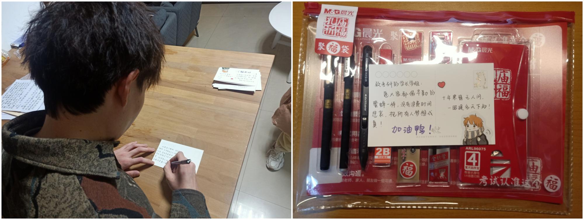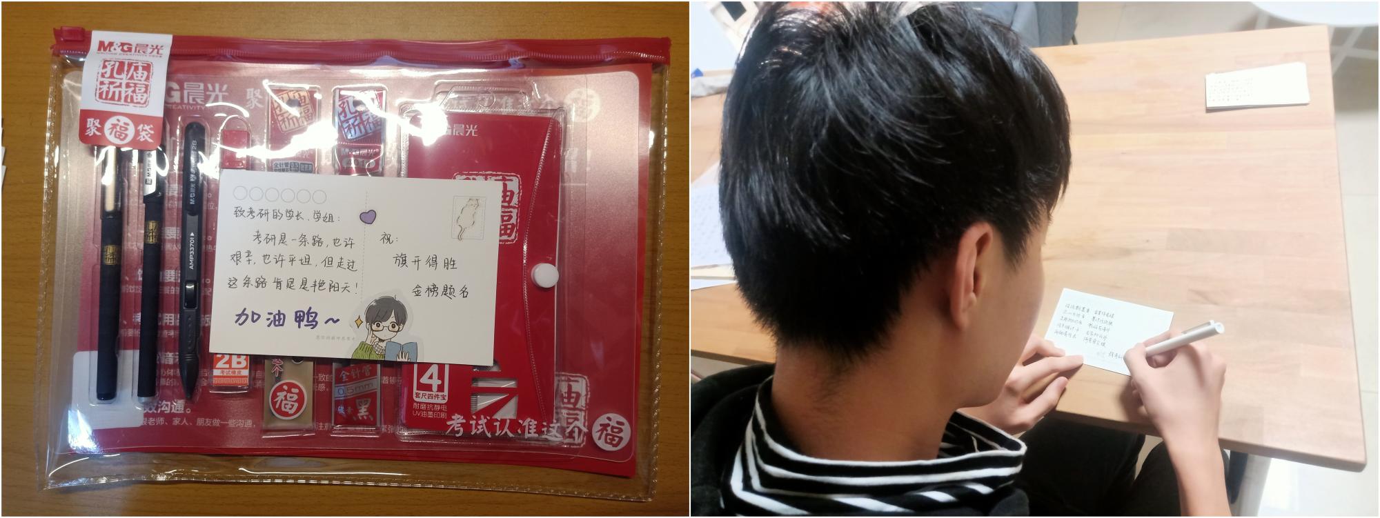 公司为每位考研学子精心准备了暖心大礼包,含有文具礼袋、牛奶、耳塞、暖宝宝、抽纸以及学弟学妹们的手写祝福贺卡。文具礼袋寓意金榜题名;暖宝宝驱走了冬日的寒冷;贺卡承载着全院师生对考研学子最真挚的期许与祝福。公司老师和学弟学妹的祝福如同冬日里跃动的火苗,温暖着考研学子的心,不仅承载了大家对考研学子成功上岸的美好祝愿,更为每一位考研学子提供了又一份精神上的支持。