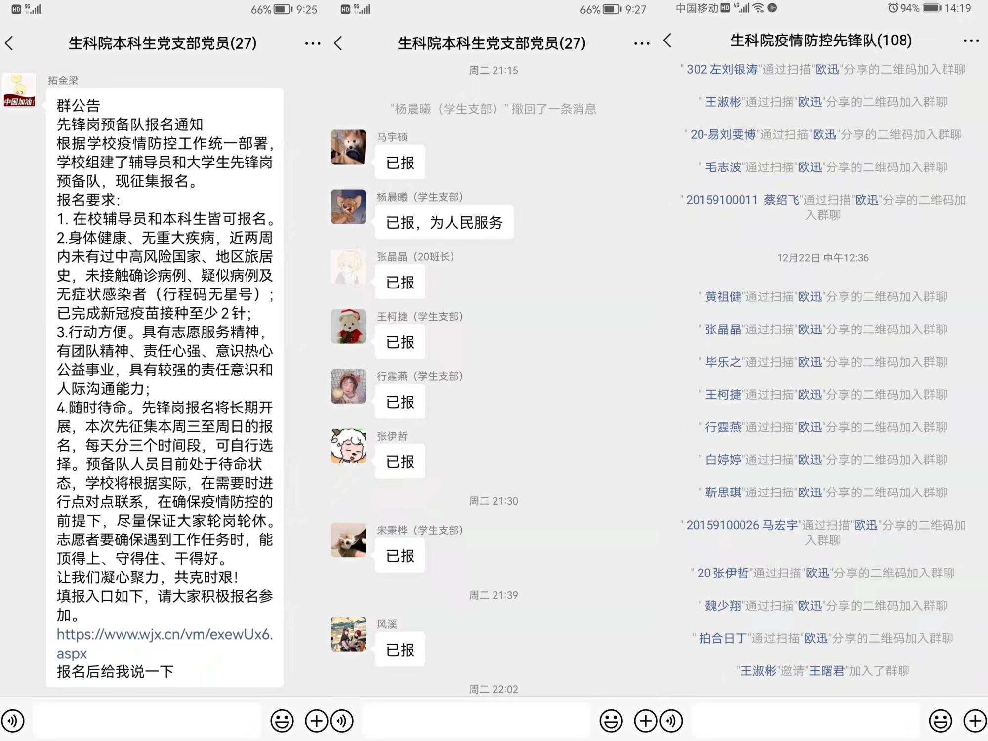 在疫情阻击战中,生科院各党支部积极响应公司党委号召,第一时间向公司全体员工进行招募并组建生科院疫情防控先锋队,在短短1小时左右的招募中,100余名同学踊跃报名加入。同学们在做好个人防护的基础上,纷纷通过各自力所能及的方式,积极投身到疫情防控中,用实际行动彰显新时代老员工的风采和本色。