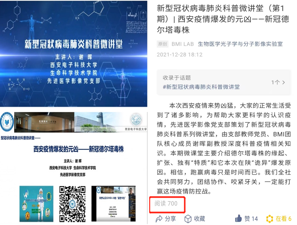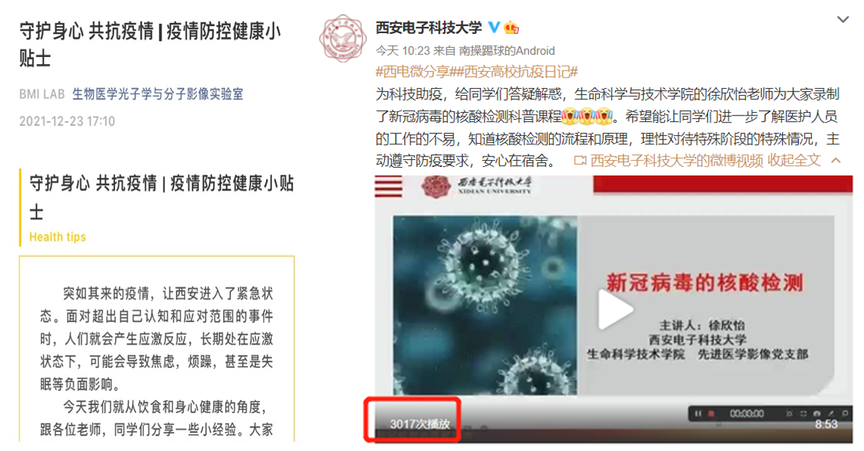 疫情期间,为帮助大家增强身体免疫力,抵抗病毒的侵袭,先进医学影像团队曾琦副教授发布疫情防控健康小贴士,从饮食和身心健康的角度跟老师和同学们分享经验,提醒大家克服心理问题,合理安排每日膳食,保证营养元素的摄入。为帮助大家更科学的认识疫情,先进医学影像党支部策划新冠肺炎科普讲堂,教师党员谢晖副教授录制新型冠状病毒肺炎科普系列微讲堂,深度科普疫情相关知识,发布当晚,首期介绍德尔塔毒株微讲堂阅读量突破七百;教师党员徐欣怡副教授录制新冠病毒的核酸检测视频,介绍核酸检测的流程和原理,被公司官方转发,六小时的微博播放量突破三千。先进医学影像党支部将继续发挥学科优势,医工结合,力克疫情!