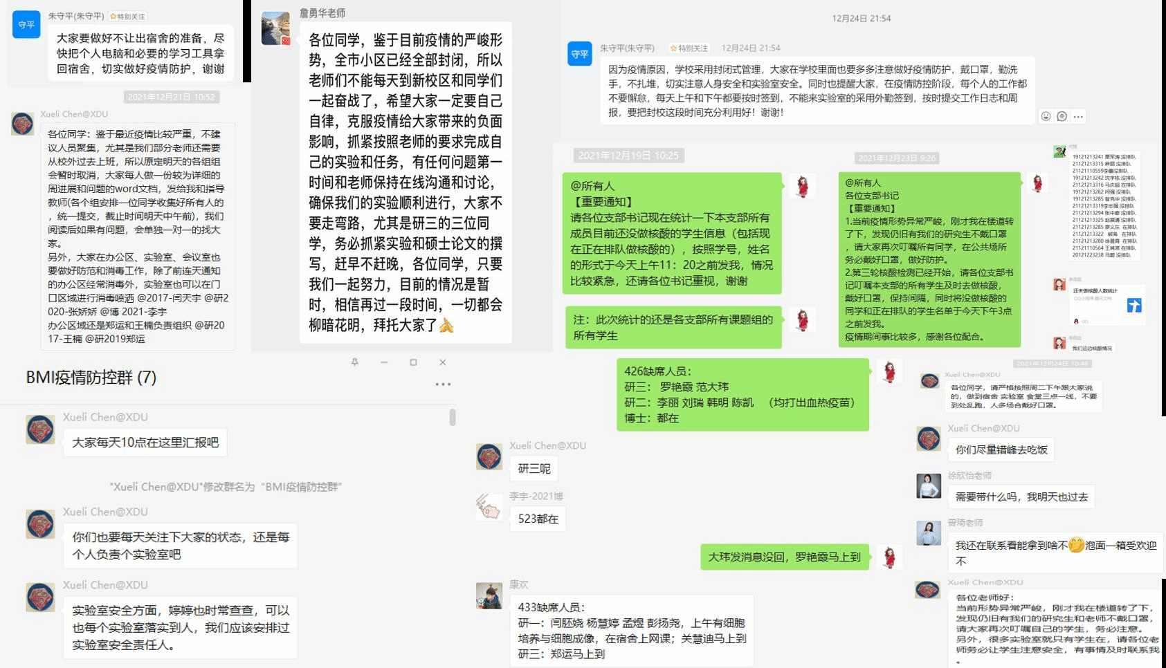 疫情初显之时,先进医学影像教师党支部各责任老师高度重视,及时响应,有序部署课题组相关工作。12月27日晚,先进医学影像党支部书记陈雪利同志线上召开团队疫情防控会,特别嘱咐大家三点:一要提高政治站位,服从安排;二要以身作则,积极参加抗疫服务工作;三要坚定信念,不信谣,不传谣,不恐慌,不添乱。另外,教师要时刻关注员工状态,加强师生沟通;严格执行公司各项安排,做好线上教学等相关工作;员工方面要做好自身防护,服从公司以及公司各项工作安排,按要求戴口罩、填报“晨午检”、参加核酸检测等工作;员工志愿者参加防疫工作一定要注意自身安全;党员同志积极发挥先锋模范作用,确保疫情防控各项工作有序进行。