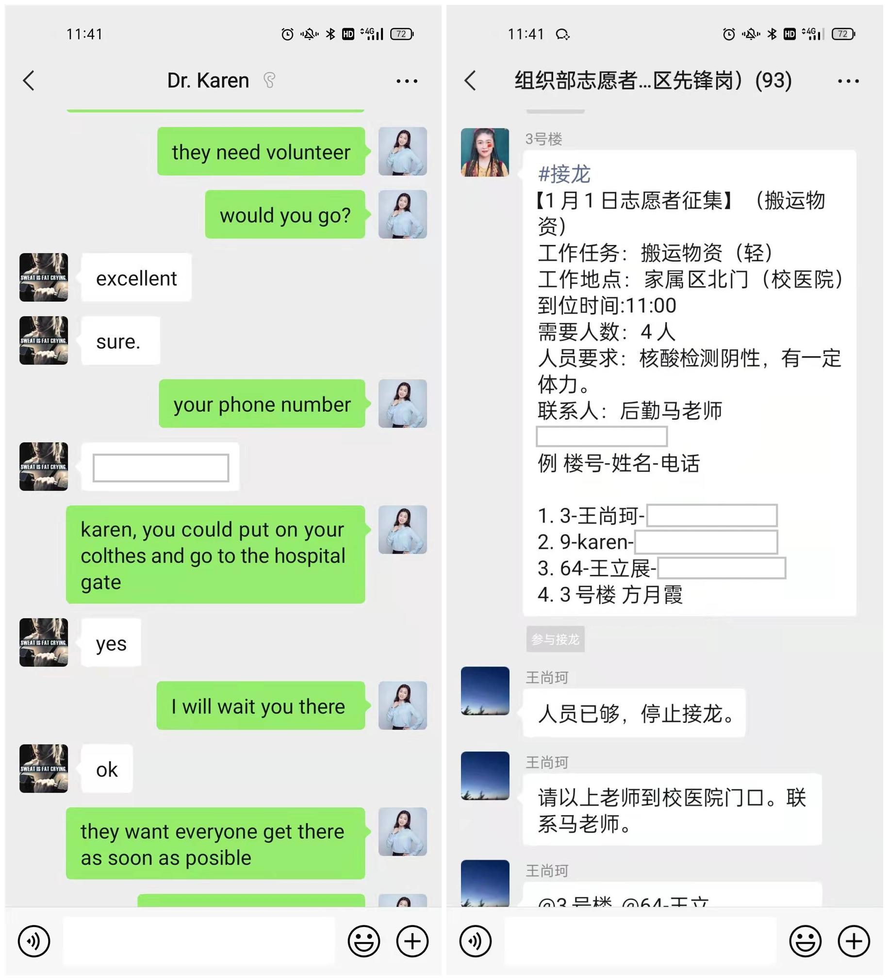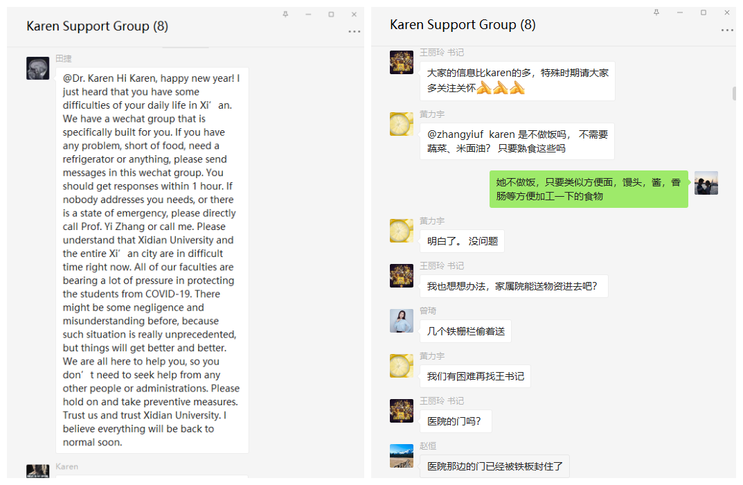 Karen居住在北校区家属区,平时多在教工食堂用餐,家中没有储备米、面、油等生活必需品。在家属区进行封闭式管理后,Karen的一日三餐遇到了很大的麻烦。在得知Karen生活上面临困难后,公司在经理田捷和党委书记王丽玲的带领下,成立了以王丽玲书记统领,以住在北校区家属院的黄力宇、赵恒、曾琦、穆俊娅、张毅老师为主的帮扶工作组,建立了“Karen Support Group”微信工作群。