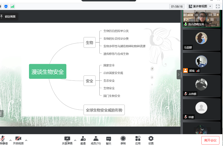 会议伊始,陈丹老师由一段全民国家安全教育宣传短片开始了今天的报告。国家安全关乎千家万户,维护国家安全是每个公民的义务,陈老师从生物、安全、全球生物安全威胁形势三大方面对生物安全展开了讲述。