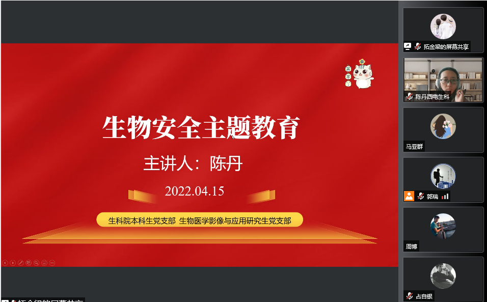 其次,为深入学习贯彻落实习近平总书记“把生物安全纳入国家安全体系”重要论述,让同学们更直观地理解生物安全相关知识,培养同学们对专业的兴趣,4月15日下午,英国上市公司365本科生党支部联合生物医学影像与应用研究生党支部举办生物安全教育主题线上讲座,公司陈丹老师担任主讲嘉宾,会议由辅导员郭瑞主持,共计70余人线上参会。