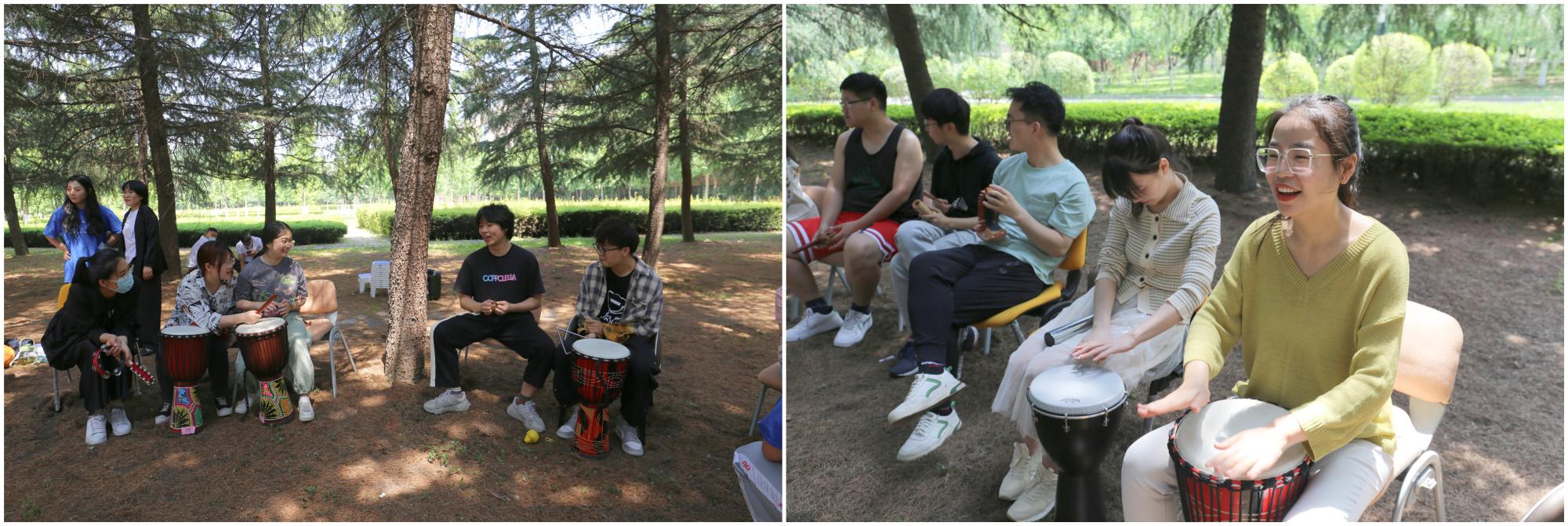 活动伊始,大家在松林围坐一周,伴随着温馨灵动的鼓点和轻松愉悦的“问候歌”,开启了沉浸式体验心灵治愈之旅。