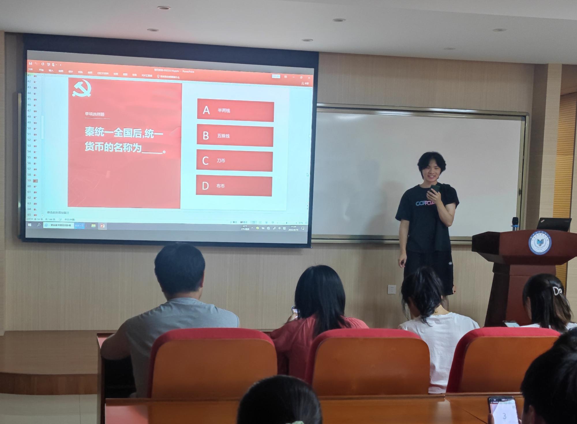 随后,陈昭旭同志带领大家举办了热烈的知识竞赛,将师生分为由毕业生带领的多个小组,并进行以“历史文化”“传统文学”“党史党建”“能源环保”为主题的四个抢答环节,将爱党爱国及传统文化教育融入其中,科普性强,趣味性高。在喜闻乐见的答题环节中,大家的学习热情与积极性被充分调动。经过激烈的比拼,师生们展现出活跃的思维和丰富的知识储备,并以优异的成绩获得了专属纪念奖品。毕业生们纷纷表示这次别开生面的毕业活动让人印象深刻、收获颇丰,成为西电求学路上独一无二的回忆。