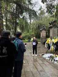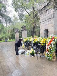 早上9时,在庄严肃穆的氛围中,师生支部的同志们穿着素衣,手持鲜花,到达了杨虎城将军的陵园。巨大的烈士陵园门扉矗立于面前,庄严肃穆的气息扑面而来,大家不由得挺直了脊梁。凝神四望,昂首的松柏仿佛是将军对民族未来的憧憬与祈望,摇曳的红旗是将军对后辈的鼓励与照拂,斑驳的青砖是支撑共和国的忠骨与气节。苍松翠柏,细雨春风掩映下的墓碑前,支部的党员同志们鞠躬献花,并为英雄默哀。
