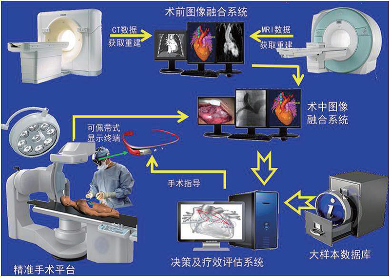医学成像新技术、多模态医学成像的图像与信息融合、大数据病例的挖掘,是实现临床精准医疗的重要工程基础。针对复杂先天性心脏病手术过程中解剖结构辨识困难、缺乏术中实时决策支持和手术效果早期评估等临床难题,基于先进的2D-3D影像配准及血管路径的智能规划算法,借助前沿的血流动力学理论及机器学习方法,配合治疗计划与术中导航,搭建先天性心脏病手术的智能辅助平台。研究组已经开发出多功能三维影像处理与显示系统,研究工作得到国家自然科学基金联合基金重点项目的资助。